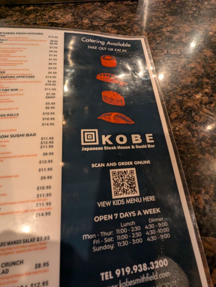 Kobe, a sushi bar and Japanese seafood restaurant located at 101 Venture Dr Smithfield, NC 27577, offers a casual dining experience with a full bar, outdoor seating, and options for takeout and delivery. Known for its delicious hibachi meals and sushi rolls, Kobe has received positive reviews from customers such as Rebecca M., who praised the friendly service and tasty filet. Diamons D. enjoyed the great food and fun atmosphere, while Michael H. was pleasantly surprised by the quality of the rolls despite initial hesitation. With a range of menu options for lunch and dinner, Kobe provides a satisfying dining experience that keeps customers coming back for more. Visit Kobe for a memorable meal that combines fresh ingredients with excellent service.